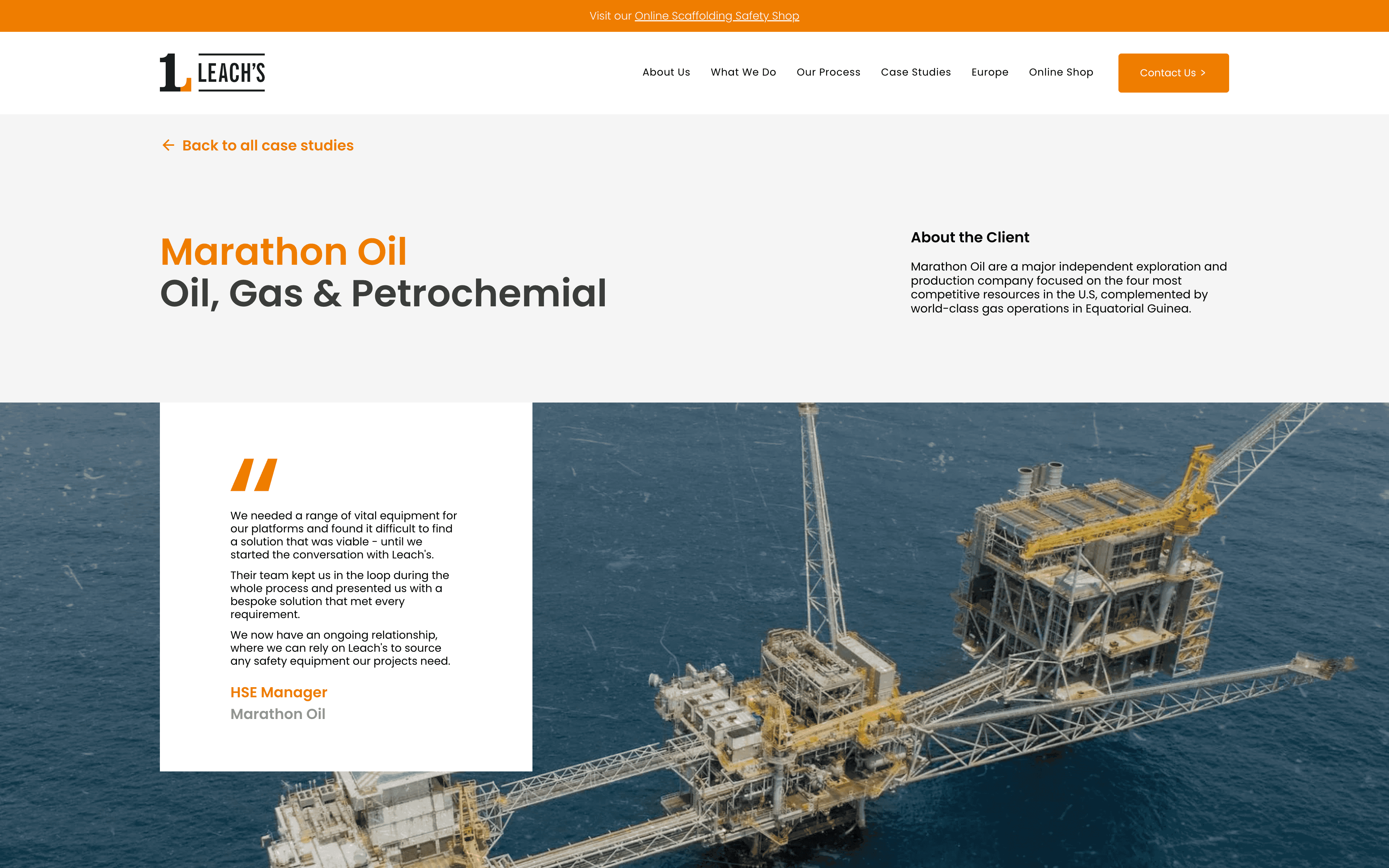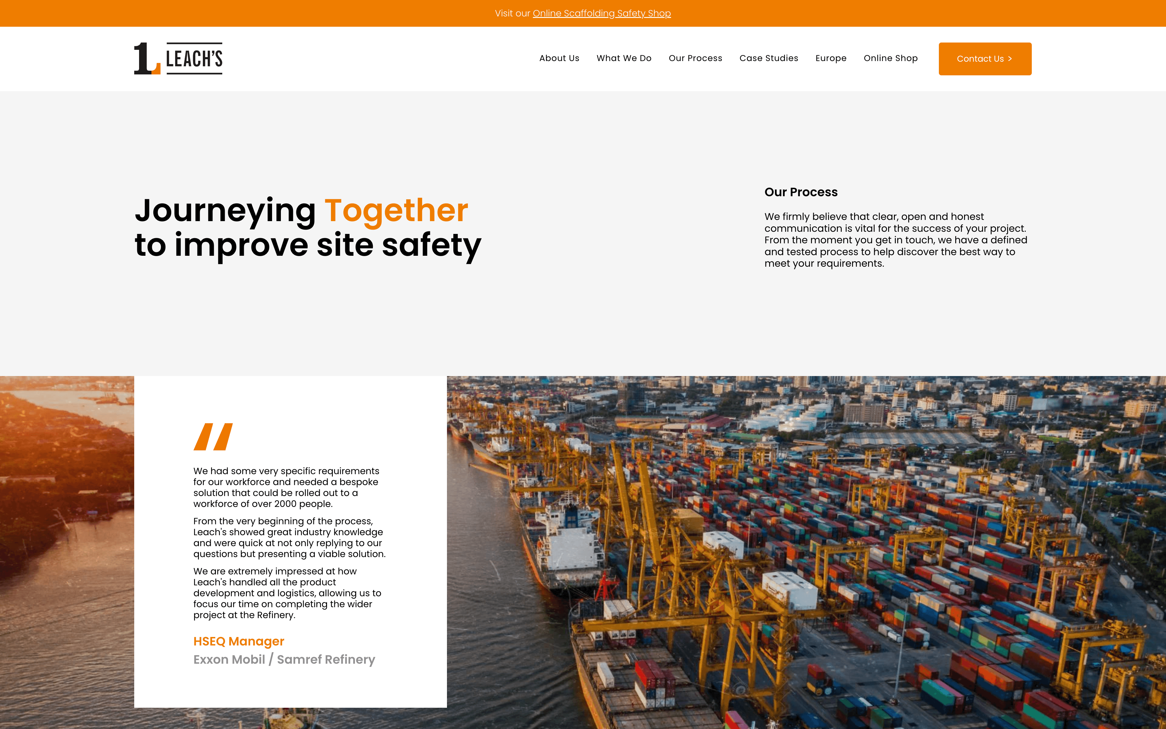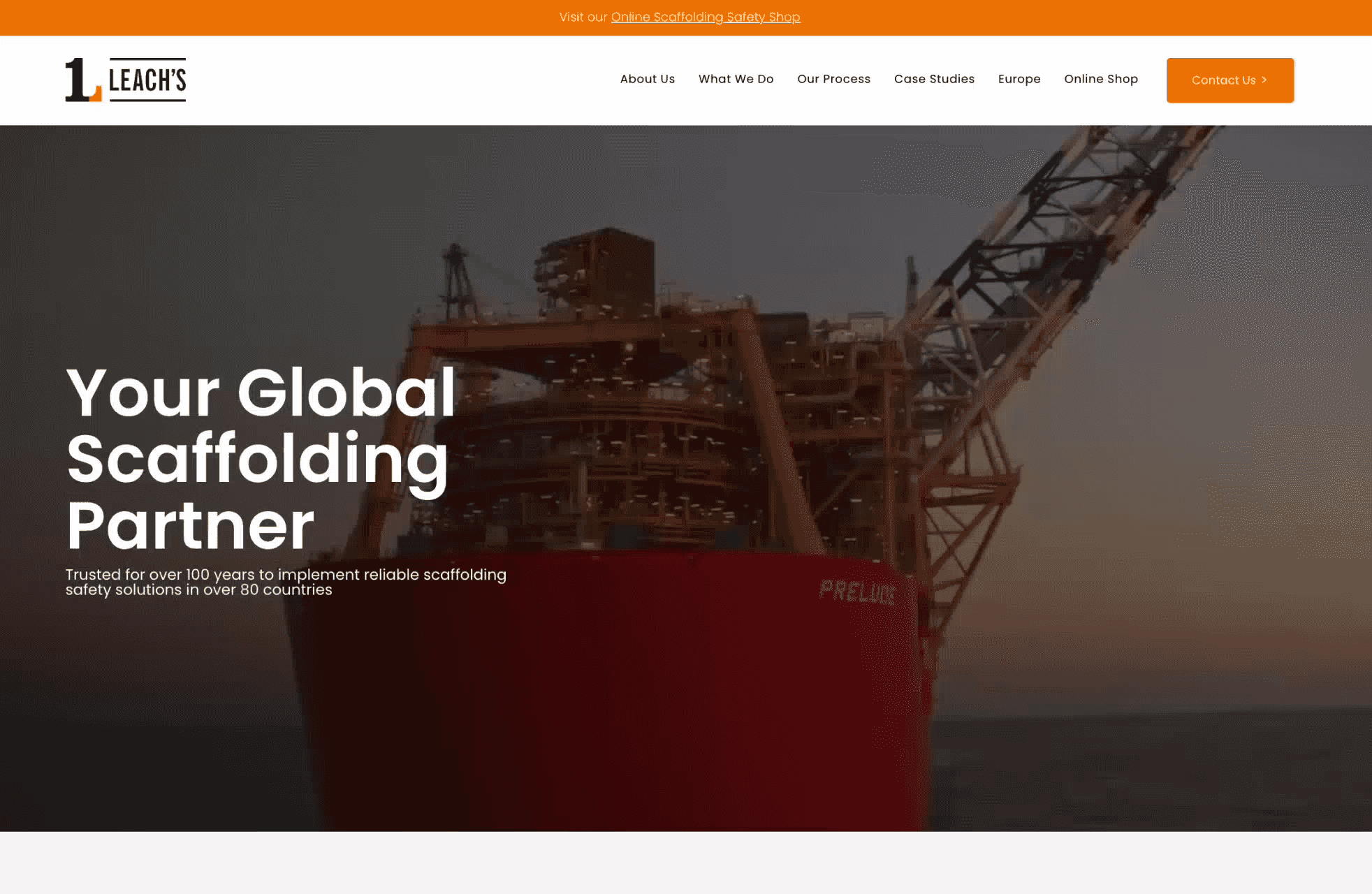 Corporate Shopify build that packages Leach’s safety expertise for enterprise buyers and supports higher-value sales conversations.